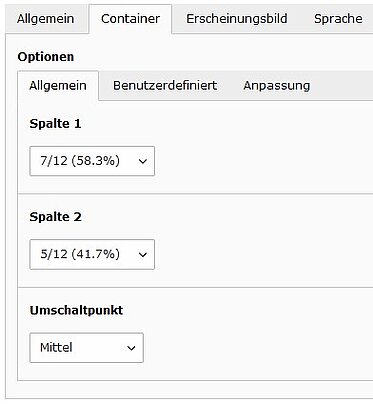 Die Standardspaltenbreite wird einfach über Auswahlfelder eingestellt. Weitergehende Anpassungen können im Tab "Benutzerdefiniert" vorgenommen werden. Siehe auch "Bootstrap grid options".
